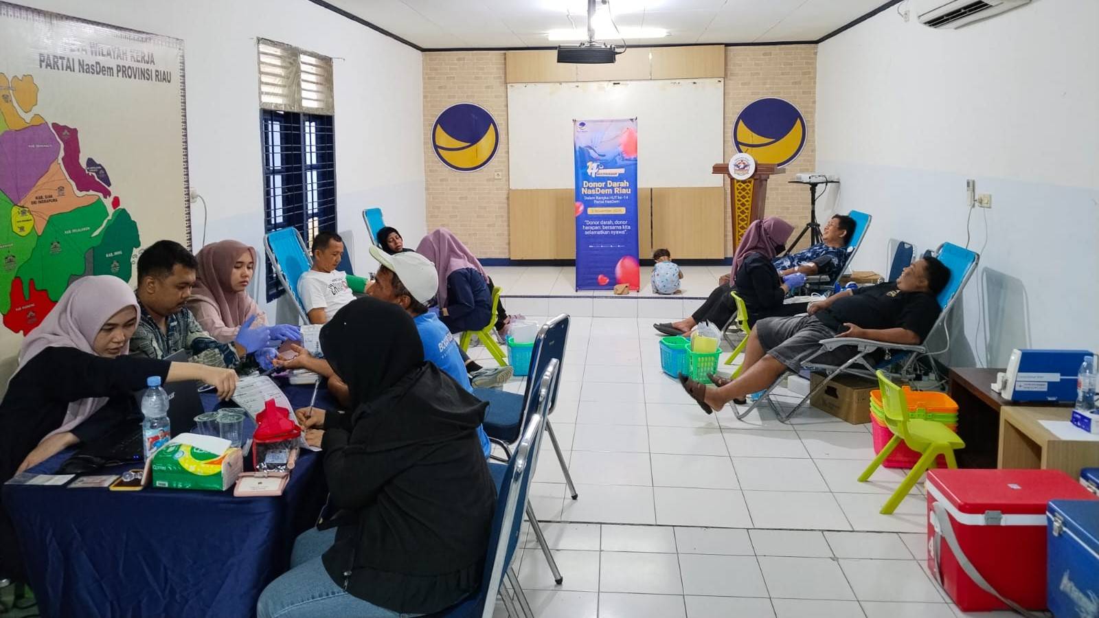 PEKANBARU (KR) Puluhan warga mengikuti aksi donor darah yang dilaksanakan DPW Partai NasDem Riau, Jalan Diponegoro, Kota Pekanbaru, Rabu (5/11). Kegiatan ini merupakan rangkaian perayaan Hari Ulang Tahun (HUT) Partai NasDem ke-14.